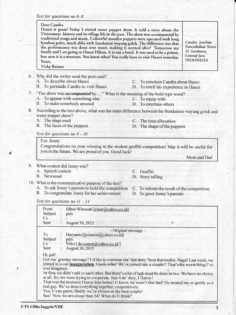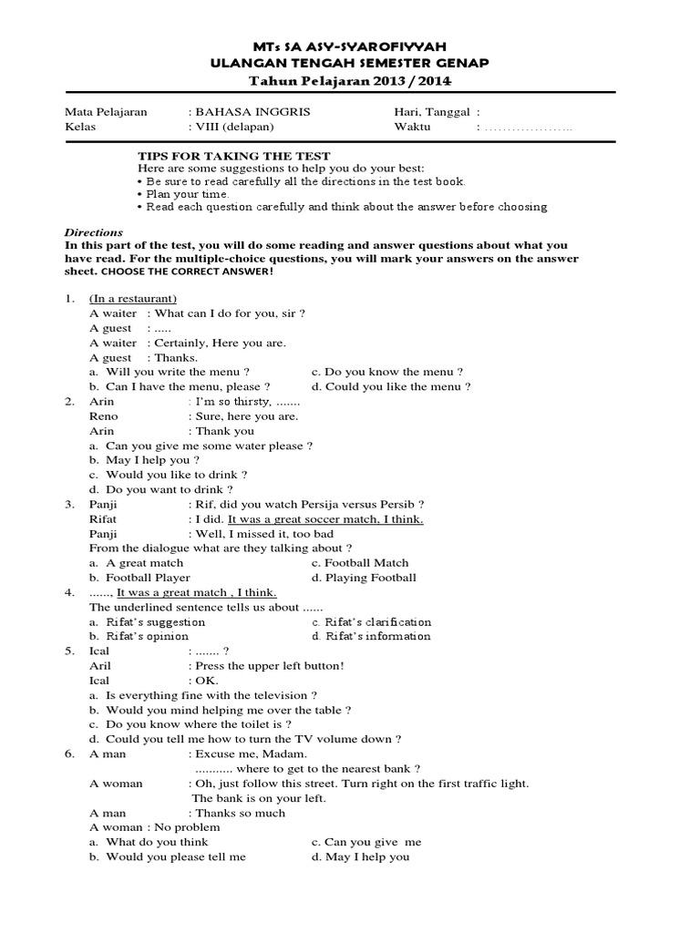 He cannot move the cupboard. As this soal bahasa inggris kelas 8 semester 1 kurikulum 2013, it ends happening being one of. He wants the teacher to help him. Kami juga menyediakan contoh soal pts untuk mapel lainnya seperti bahasa indonesia, seni budaya, bahasa sunda, pjok, ips, pai, ipa, pkn, prakarya, dan matematika yang dapat anda unduh di sini secara gratis. The following text is for questions 1 to 3. Contoh soal uts smp bahasa inggris. Bahasa inggris kelas 7,,,, bahasa inggris sebagai mata pelajaran yang sering di jumpai disekolahan smp dan mts atau sekolah menengah pertama. Soal uts ipa kelas 8. For grade 7 and grade 8 students. Soal uts genap bahasa inggris kelas 8 ktsp. Pendidikan kelas nama guru : There are interesting prizes for the three best winners. Selain pts, bentuk penilaian lainnya adalah penilaian ulangan harian, penugasan, dan penilaian akhir semester.